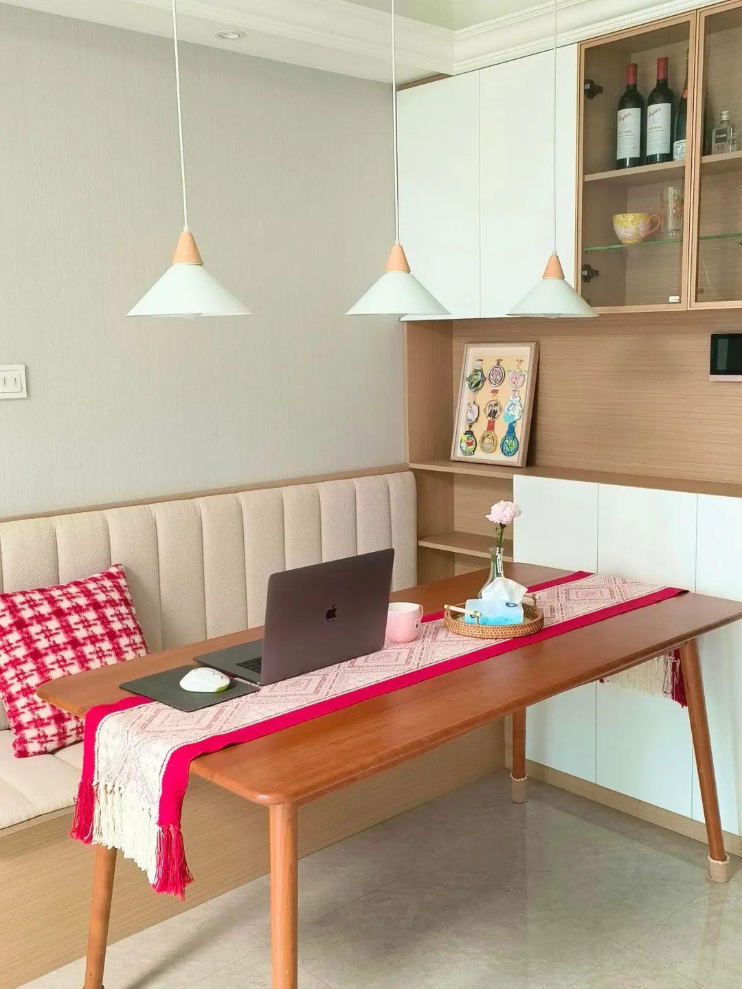 现在,她家入住一年了,用下来觉得这种卡座很香,餐厅区域不占多少地,且这一块收纳力很强,人多吃饭以及平常两人在这边办公都很舒服。