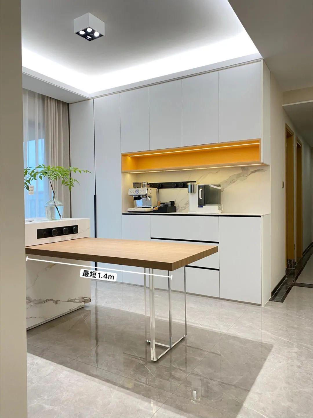 岛台+伸缩餐桌拉伸的设计,既能解决空间小的难题,还能拉伸变大,聚餐使用。